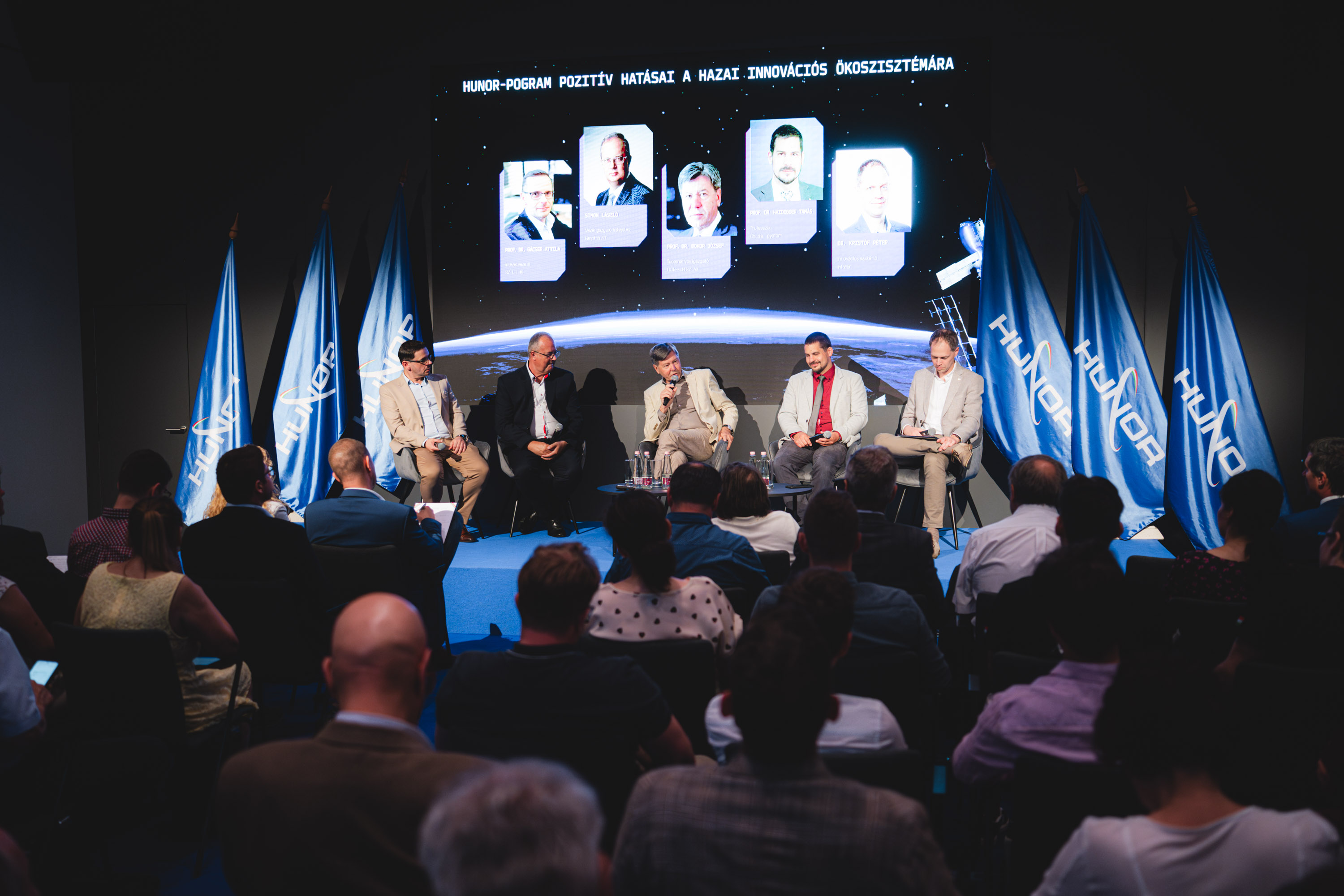 Kristóf Péter, az Infotér innovációs szakértőjének moderálásával Bokor József, a HUN-REN Számítástechnikai és Automatizálási Kutatóintézet tudományos igazgatója a Széchenyi István Egyetem Járműipari Kutatóközpontjának elnöke, Prof. Dr. Gácser Attila, az SZTE TTIK intézetvezetője, Prof. Dr. Haidegger Tamás, az Óbudai Egyetem professzora; az Initium Venture Labs Zrt. vezérigazgató-helyettese valamint Simon László Grepton Zrt. vezérigazgatója a HUNOR program pozitív hatásairól beszélgetett a hazai innovációs ökoszisztémára.